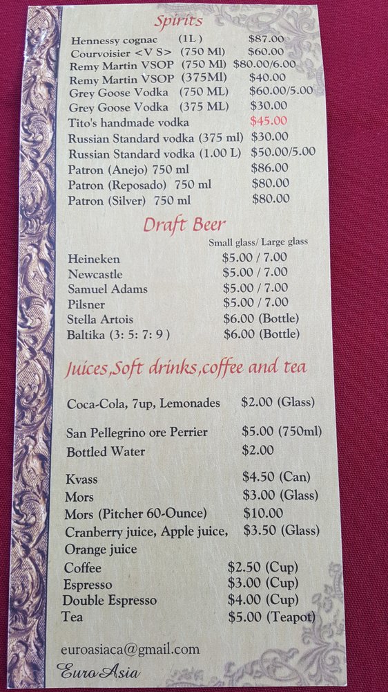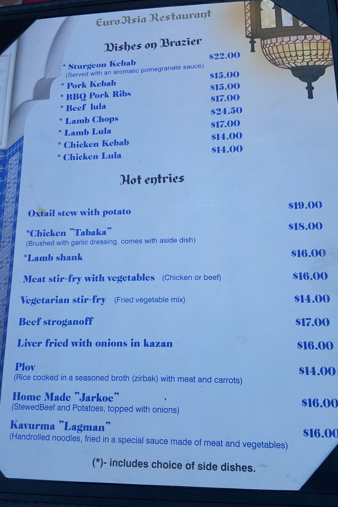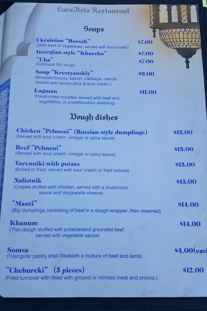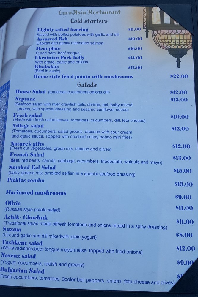 Situated in Encino, CA, EuroAsia is a Ukrainian-Uzbek-Russian fusion restaurant that offers a delightful culinary journey. With a diverse menu that includes pelmeni, mushrooms, potatoes, chebureki, kabab, and more, EuroAsia brings the flavors of Europe and Asia together in a unique way. The ambiance is elegant yet welcoming, making it a perfect spot for a memorable dining experience. Customers rave about the impeccable service and attentive staff, ensuring a top-notch dining experience. Whether you're looking for a taste of childhood comfort food or trying something new like Uzbek cuisine, EuroAsia's menu has something for everyone. From the crispy chebureki to the refreshing cold salads, each dish is made with care and attention to flavor. The combination of traditional recipes and modern twists makes EuroAsia a must-visit destination for food enthusiasts seeking a unique and unforgettable dining experience.